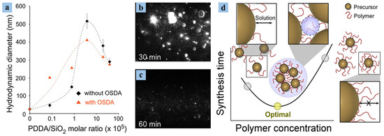 Recently, by studying the effects of several kinds of polyquaternary amines on the nucleation of SSZ-13 zeolites, Rimer and coworkers found that PDDA has the most pronounced impact on the kinetics of SSZ-13 formation, leading to a 4-fold reduction in crystallization time [44]. The dynamic light scattering (DLS) characterization results demonstrated that PDDA could accelerate the aggregation of precursors at a critical concentration (Figure 8a). In addition, oblique illumination microscopy (OIM) studies (Figure 8b) revealed that the addition of the optimal concentration of PDDA to the synthesis system could facilitate the assembly of soluble silicates into denser phases. The authors proposed that the optimal scenario at intermediate PDDA concentrations may lead to precursor clustering, akin to bridging flocculation. This is a characteristic of polymer–colloid interaction at low-to-moderate polymer concentrations. The precursor particles within these clusters could maintain a high level surface area contact with the solution, thus creating confined regions of entrained supernatant solution. These confined regions might speed up the nucleation via pathways that seem to include more facile mass transfer and exchange of aluminosilicate species among solid and solution phases, thus creating a localized high concentration of soluble species where precipitation can be accelerated by the introduced PDDA (Figure 8d).