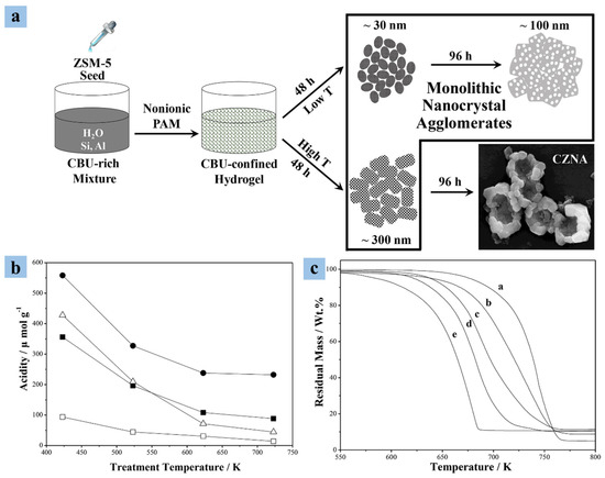 (a) Schematic representation of morphology variation of ZSM-5 nanocrystal agglomerates; (b) acid amount characterized at various treatment temperatures: 523, 623, and 723 K for S10 (open square), S11 (solid square), S12 (open triangle), and S2 (solid circle), respectively; (c) residual weight curves of LDPE cracking over (a) blank, (b) S10, (c) S11, (d) S12, and (e) S2. (Reprinted with permission from [55]. Copyright: 2019, Elsevier, Amsterdam, The Netherlands).