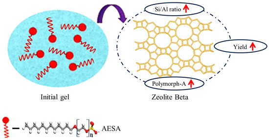 As a commercially available anionic surfactant, fatty alcohol polyoxyethylene ether ammonium sulfate (AESA) has an amphiphilic structure, which possesses a negatively charged sulfate head and a hydrophobic carbohydrate chain on the other end [68]. Recently, Hao and coauthors reported that AESA could be used as a ZGM for the synthesis of zeolite β crystals with improved yield and increased framework Si/Al ratios [68]. During the crystallization process, the AESA anion affected the condensation reaction of two Si(OH)4 molecules by hydrogen bonding interactions, thus facilitating the formation of Si-O-Si bonds and leading to the improvement of the efficiency of Si incorporation. In addition, by optimizing the usage amount of AESA, the enrichment of polymorph-A was achieved, with the proportion of polymorph-A as high as 77.9% (Figure 13). These results suggest that AESA might act as a crystal growth modifier, which can bind selectively to certain faces of zeolite β during crystallization and change the anisotropic rates of surface step growth. The authors believe that the resultant zeolite β with a chiral structure should have both shape selectivity and enantioselectivity, which is of significance in enantioselective catalysis and separation.