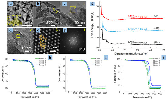 By using a polymer named poly(1,4-cyclohexylacetone dimethylene ketal)–poly(1,5-pentylacetone dimethylene ketal (denoted as PK3) as a multifunctional template, Yue and coauthors synthesized aluminum-rich hierarchical ZSM-5 zeolite (Si/Al = 8) with abundant mesopores, comprising oriented and assembled nanocrystals (Figure 15a–d) [73]. The authors proposed that the PK3 polymer could serve as a template for the construction of the microporous/mesoporous structure and also act as a crystal growth modifier to construct a single-crystalline zeolite. The fast Fourier transform diffraction pattern shows that the resultant zeolite particle has clear and regular diffraction spots, suggesting the [010] orientation of the nanocrystal (Figure 15e,f). The fact that the nanocrystals are assembled in the same orientation is an indication that PK3 could act as a modifier to interact with the specific facets of ZSM-5 zeolite crystals. To verify this point, the authors probed the interaction of PK3 with different MFI surfaces by means of USMD (umbrella sampling molecular dynamics) simulations to calculate the adsorption free-energy profile (F(z)). The adsorption free energy of PK3 for the [010] facet is the lowest, suggesting that PK3 preferentially binds to the MFI [010] facet through the hydrogen bond between alcohols on PK3 and the exposed Si-OH or Al-OH groups presented on the [010] facet (Figure 15g). In this case, crystal growth in the [010] direction is considerably inhibited, leading to an identical orientation. The hydroxyl groups existing in PK3 can also chelate with Al3+ cations, which favors a higher Al incorporation rate in the final zeolites.