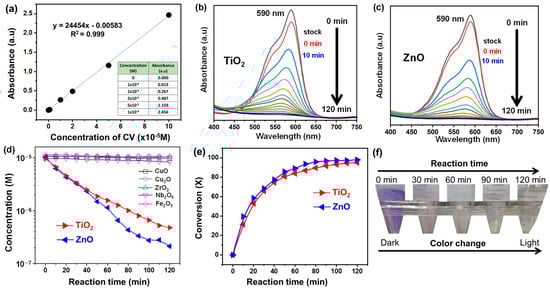 A calibration plot with varying CV concentrations was obtained as a reference (Figure 1a). The line of best fit was utilized to find the equation that best correlates the absorbance to the concentration of the CV. As shown in Figure 1b,c, TiO2 and ZnO successfully decomposed the CV, while other metal oxides, such as CuO, Cu2O, ZrO, Nb2O5, and Fe2O3, showed no catalytic performance (Figure 1d). TiO2 and ZnO showed 95% and 98% CV conversion, respectively, within 2 h (Figure 1e). C. Shaoo et al. studied photocatalytic activity for CV decomposition over bulk TiO2 and Ag+-doped TiO2 to understand the effect of Ag+ on catalytic performance [25]. Although the Ag+-doped TiO2 showed the advantage of easy separation compared to the TiO2, the conversion of CV over two catalysts was similar: for the TiO2, it was ~97% within ~2 h, and for the Ag+-doped TiO2, it was ~99% within ~2 h. Recently, M.G. Sanakousar et al. investigated the decomposition of CV over ZnO and Cd-ZnO (mol% of Cd = 0.5~2.0%) catalysts and reported a high efficiency of bulk ZnO and Cd (0.5%)-ZnO (~92% CV conversion at 120 min), while ≥1.0% Cd reportedly leads to comparatively lower photocatalytic activity (80~85% CV conversion) [26]. The authors claimed that increasing electron hole recombination rates and multiple charge carriers’ trapping phenomena cause a decrease in catalytic performance. For comparison purposes, dye chemicals’ decomposition over ZnO and TiO2 have also been reported [27,28]. D. R. Shinde et al. studied the photocatalytic degradation of CV, basic blue (BB), and methyl red (MR) under solar irradiation over ZnO, TiO2, and SnO2 and reported that ZnO showed the highest photocatalytic activity, followed by TiO2 and SnO2 [27]. The specific surface area of ZnO (~12 m2/g) was higher than that of TiO2 (~5 m2/g), which, coupled with the greater quantum efficiency of ZnO compared to TiO2, explains its higher overall photocatalytic performance. The difference between the results for the stock 10−5 M CV solution and for after the addition of the respective catalysts (TiO2 or ZnO) and UV light irradiation source indicates that a larger number of moles were adsorbed following the prestir step of the experimental protocol for the TiO2 sample compared to the ZnO sample (Figure 1b,c). The CV decomposition results depicted in Figure 1d are well matched to the reported ones, as highlighted in Table 1. Figure 1f shows the visual decolorization of CV during the reaction with the TiO2 catalyst. The intensity of the CV color (purple) faded with increasing reaction time.