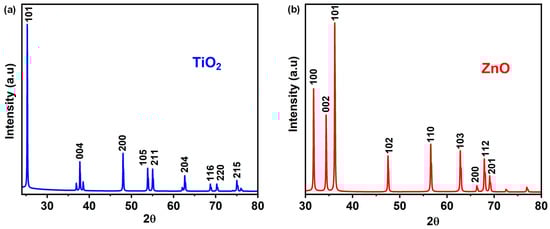 XRD patterns of (a) anatase titanium dioxide (TiO2) and (b) zinc oxide (ZnO).
