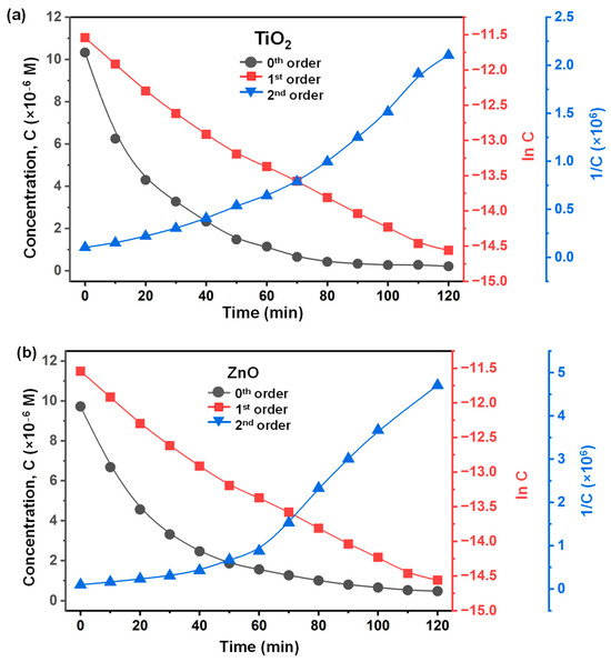 where K is the adsorption equilibrium constant, k is the rate constant of the reaction, C is the CV concentration, and t is the reaction time. Since low concentrations of CV (highly diluted with water) were used in this study, it should be assumed that KC is much lower than 1 (KC << 1). The first-order rate law is shown in Equation (1). To confirm that the working catalysts follow the Langmuir–Hinshelwood model, concentration (C), ln (C), and 1/C as a function of reaction time, which correspond to zero-, first-, and second-order reactions, respectively, were investigated. As shown in Figure 6a,b, the ln (C) vs. time shows a linear line, indicating the first-order kinetics [59]. The rate constant (kapp), slope of the first-order plot of the ZnO (0.036 min−1) was higher than that of TiO2 (0.028 min−1).