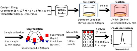 For the CV decomposition reaction, 25 mg of metal oxide and 50 mL of CV solution were added into a 100 mL beaker containing a magnetic stirring bar. The beaker was transported to a UV cabinet (Mini UV Viewing cabinet, UVP, Inc., Upland, CA, USA, 95-0072-01, UVP C-10). Before exposing the CV solution with metal oxide to UV light, pre-stirring was performed for 60 min in a darkroom environment (i.e., a light-isolated environment with the UV light turned off) to ensure the homogenized mixing of catalysts and reactants. Following the pre-stirring step, the UV lamp (Handheld UV Lamp, UVP. LLC., 95-0005-05, UVGL-58) was turned on at the desired wavelength (i.e., 365 nm). During the reaction, 2 mL of the solution was collected at 10 min intervals and centrifuged at 3200 rpm for 5 min to separate the catalyst from the mixture. After centrifugation, 100 µL of the solution was extracted and put into three wells of a 96-well microplate (Corning™ Clear Polystyrene 96-Well Microplates, Corning, Glendale, AZ, USA) for analysis inside a Tecan UV Vis-spectrophotometer (Infinite Pro 200, TECAN, Morrisville, NC, USA). Absorbance data were collected 5 times from wavelengths of 230 nm to 1000 nm with a 2 nm step size. A schematic diagram of the reaction procedures and experimental conditions (i.e., time, speed) is shown in Scheme 1.