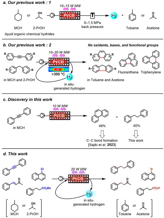 Hydrogen gas (H2) is one of the most important and sustainable clean energy alternatives to fossil fuels because, after the combustion of H2, only H2O is produced instead of gases with high global warming potential such as CO2 [1,2,3]. Owing to its usefulness and sustainability, H2 is widely used as an energy source in fuel cells and holds promise for various applications as a carbon-free energy source [4,5,6,7,8]. H2 also serves as a vital reducing agent in organic synthesis [9,10]. However, large-scale storage, transportation, and handling of molecular hydrogen are challenging, not only because of regulatory restrictions on highly flammable and explosive gases but also due to the need for control based on physical properties such as specific gravity, boiling point, and boil-off, as well as to infrastructure development costs and other cost issues [11,12,13,14,15,16,17,18]. In response to these challenges, chemically stable substances known as liquid organic chemical hydrides (LOCHs) have received much attention [13,19,20,21,22,23,24]. Methylcyclohexane (MCH) is a type of LOHC that can store more than 500 times its own volume of H2 gas and can be transported via pipelines, tankers, and road tankers, which are part of fossil fuel infrastructure [25,26,27,28]. Therefore, significant efforts have been devoted to the development of hydrogen extraction and utilization methods using MCH as a promising material for hydrogen storage applications [29,30,31,32,33,34,35,36]. Kobayashi et al. reported the continuous-flow hydrogenation reaction of olefins using H2 gas extracted from MCH under a parallel catalyst cartridge system, which continuously generated H2 gas from a heterogeneous Pt catalyst-packed cartridge, with a solution of a substrate possessing an olefin moiety flowing into another heterogeneous Pd catalyst-packed cartridge [37].