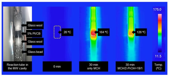 Subsequently, the effect of the co-solvent was investigated (Table 3 and Table S1). We previously demonstrated that C–C bond formation reactions proceed smoothly under MW irradiation using MCH with 2-PrOH as the co-solvent. Drawing from our earlier studies, various mixed solutions (0.05 M) of 1 were introduced into the 5% Pt/CB (80 mg)-packed quartz cartridge at 140 °C at a flow rate of 0.25 mL/min under MW (20 W) irradiation. When 2-PrOH was used as a co-solvent (MCH/2-PrOH = 4/1), the ratio of 4 greatly decreased, and the ratio of 2 increased to 94%, but 5% of unreacted starting material (1) remained (Entry 2 vs. 1). When the proportion of 2-PrOH was reduced further to MCH/2-PrOH = 19/1, 1 was completely consumed to yield 2 with a GC ratio of 98% and an isolated yield of 91% (Entry 3). The production ratio of 2 decreased slightly with a lower proportion of 2-PrOH (MCH/2-PrOH = 99/1) (Entry 4). When only 2-PrOH was used as the flow solvent, the reaction efficiency significantly decreased (the production ratio of 2 was 48%), and 52% of 1 remained unchanged (Entry 5). The addition of an appropriate amount of 2-PrOH as a co-solvent improved the solubility of the substrate. Additionally, because 2-PrOH also absorbs MWs, it was expected to dissipate the MW energy absorbed by 5% Pt/CB in the catalyst cartridge and suppress the thermally induced C–C cleavage reaction (generation of 4). Thermographic measurements of the temperature of a quartz cartridge packed with 5% Pt/CB (80 mg) in an MW cavity (heater) mechanically set at 140 °C with the slit open showed that when an MCH solution of 1 (0.05 M) was pumped, the catalyst layer temperature reached 164 °C 30 min after the start of pumping. In contrast, the solution of 1 in MCH/2-PrOH = 19/1 (0.05 M) was at 126 °C, which was lower than the set temperature. This result strongly supports the partial absorption of MWs by 2-PrOH that, used as a co-solvent, dispersed MW energy that would otherwise be absorbed by CB (Figure 2).