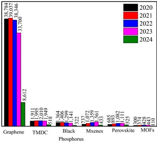 An analysis of the importance of the 2D-layered materials (e.g., TMDCs, graphene, MOFs, and perovskite) from 2020 to 2024 by the Web of Science database (26 April 2024).