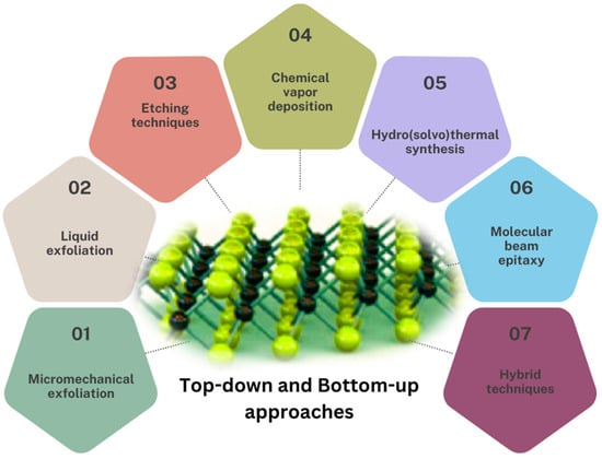 As we know, the top-down and bottom-up approaches are widely used in the literature to obtain the 2D-layered TMDC structures. The top-down method involves synthesizing 2D materials from 3D counterparts by breaking intermolecular bonds, while the bottom-up approach entails building 2D materials from individual atoms and molecule precursors. Figure 3 presents an overview of the synthetic methodologies utilized in acquiring 2D-layered TMDCs, as discussed within the context of this review.