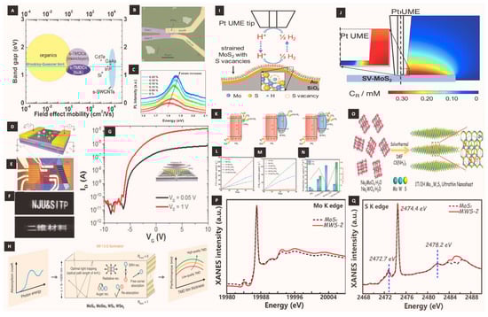 In the diverse family of TMDCs, one compound that stands out is MoS2, where two planes of sulfur anions are sandwiched between a sheet of molybdenum cations [96]. Notably, it is well known that MoS2 forms a stable 2D structure and presents distinctive electronic, optical, and catalytic properties [97,98,99,100]. In the 1970s, researchers discovered that MoS2-based catalysts exhibited remarkable efficiency in hydrodesulfurization processes, crucial for removing sulfur impurities from petroleum feedstocks to produce cleaner fuels. MoS2 catalysts doped with Ni and Co became integral to the petroleum refining industry, enabling the production of low-sulfur fuels in compliance with environmental regulations [99,100,101]. Additionally, MoS2 is widely used in the automotive, aerospace, and manufacturing industries as a solid lubricant to reduce friction and wear in mechanical devices [101,102].