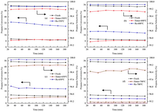 After regeneration, the conversion and selectivity of the four catalysts showed varying degrees of improvement. Among them, the Re-550 °C catalyst achieved the highest initial propane conversion of 34.7%. The Re-600 °C and Re-650 °C had similar initial propane conversion of around 23%, higher than the Fresh catalyst. In contrast, Re-700 °C only had a conversion of 6%, slightly higher than the Sinter-700 °C catalyst, but still lower than the Fresh catalyst, indicating that its activity could not be fully restored under these regeneration conditions. This suggested that the oxidation temperature directly affected the regeneration of the catalyst. High oxidation temperatures may hinder or prohibit the recovery of catalytic performance through the oxychlorination process, possibly due to the severe sintering of active metal. The selectivity to propylene on all the regenerated catalysts (>99.5%) is higher than that of the Fresh catalyst.