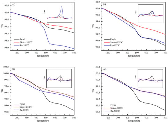 TG and DTG curves of the spent catalysts before and after regeneration: (a) catalyst oxidation at 550 °C, (b) catalyst oxidation at 600 °C, (c) catalyst oxidation at 650 °C, (d) catalyst oxidation at 700 °C; the vertical line indicating the peak temperature for weight loss.