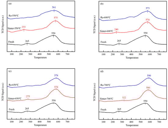 H2-TPR images of catalysts after oxidation under different temperatures: (a) catalyst oxidation at 550 °C, (b) catalyst oxidation at 600 °C, (c) catalyst oxidation at 650 °C, (d) catalyst oxidation at 700 °C.