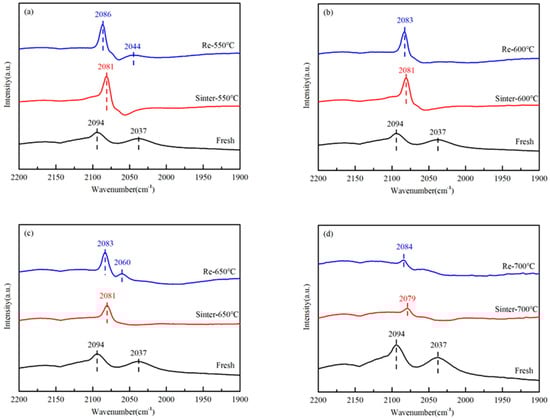 After oxychlorination regeneration, the bands at ~2080 cm−1 exhibited a blue shift, possibly because the introduction of Cl during the oxygen–chlorine process reduced the electron density on the Pt surface in close contact with the highly electronegative Cl [43]. A band at 2044 appeared after regeneration under 550 °C and was ascribed to Pt3Sn alloy, which verified the redispersion of metal species during the process. A 2060 cm−1 band appeared after regeneration under 650 °C and still could be observed after 700 °C regeneration, which was due to the sintering of Pt during high-temperature oxidation and the formation of well-coordinated Pt metallic particles (refer to Figure 5).