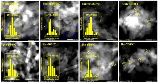 After oxychlorination regeneration, the dispersion of the catalysts oxidized at 550 °C, 600 °C, 650 °C, and 700 °C increased to 82.98%, 63.57%, 59.41%, and 19.44%, respectively, and the calculated particle sizes were 1.20 nm, 1.57 nm, 1.62 nm, and 4.85 nm, respectively. The particle size determined from HAADF-STEM results showed that the average particle size of the catalysts after regeneration at 550 °C, 600 °C, and 650 °C were 1.23 nm, 1.48 nm, and 1.55 nm, which were well consistent with those from CO-Chem results. Among them, the catalyst oxidized at the lowest temperature (550 °C) could be fully regenerated, whose dispersion surpassed that of the Fresh catalyst. The catalysts oxidized at 600 and 650 °C could be partly recovered for their dispersions. For the catalyst regenerated at 600 °C, although most particle sizes center around 1.55 nm, there were still a few particles above 3 nm that could not be dispersed. For the Re-700 °C catalyst, it was observed that although a few particles were redispersed into small particles of 1~2 nm after regeneration, most of the particles of 3 nm and above remained. Therefore, under the regeneration conditions used here, the oxygen–chlorine treatment had a good redispersion effect on particles in the 1~2 nm range, but was not suitable for catalysts with a large number of particles sized 3 nm and above.