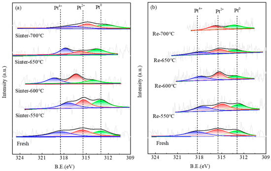 XPS was used to analyze the changes in the valence states of the Pt and Sn in the sinter and Re catalysts. The results for Pt 4d5/2 orbital spectra are shown in Figure 6. It can be observed that the Fresh catalyst exhibited three characteristic peaks at 318.5 eV, 315.5 eV, and 313.0 eV, corresponding to Pt4+, Pt2+, and Pt0 species, respectively. After oxidation treatment, the peak intensity of Pt gradually decreased with the increasing oxidation temperature, becoming very weak to Sinter-700 °C due to the segregation of Sn species on the Pt surface, which was consistent with the results from CO-DRIFTS. All three characteristic peaks of Pt in Sinter-700 °C migrated to lower binding energy, indicating that the high-temperature oxidation treatment could aggregate Pt metal, reduce its electron density, and increase the proportion of the Pt0 species. Among all the four Sinter series samples, Sinter-600 °C had the highest binding energy of Pt species. This result seemed to be contradictory with results from other samples because aggregation of Pt metal generally lowers its binding energy. But it should be noted that the existence state of Sn also changed the binding energy of Pt species. From Figure 7, it can be observed that Sinter-600 °C has the lowest SnOx/Sn ratio, indicating that part of the Sn species segregated from Pt-Sn bimetal particles and increased the binding energy of Pt.