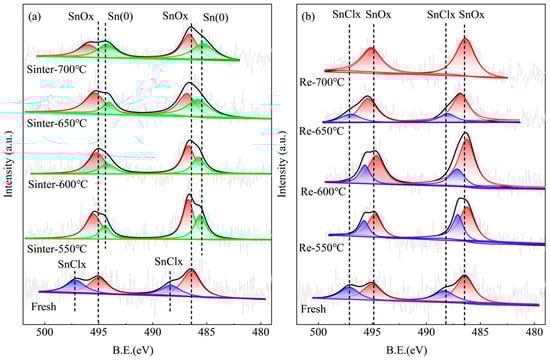 The XPS spectrum of the Sn component is shown in Figure 7. The peaks of binding energy at 488.3 and 487.1 could be attributed to the Sn(IV) and Sn(II) chlorinated species, respectively [45,46]. The component at a binding energy of 486.6 eV was characterized as SnOx, either in the Sn4+ or Sn2+ state [47,48]. The peak at 485.2 eV was attributed to metallic Sn species. This binding energy was close to that reported by Virnovskaia et al. [48], which is slightly higher than Sn3d in a metallic state, around 484.5–484.9 eV [49], and could be ascribed to quasi-metallic Sn, resembling the O-Sn chemisorption state. For the Fresh catalyst, Sn existed in SnClx and SnOx states. During oxidation treatment at different temperatures, the Sn-Cl bond was boken, and Sn species may migrate and interact with supports and form quasi-metallic Sn, as evidenced by the shift in binding energy to higher binding energy when the oxidation temperature increased from 550 °C to 650 °C. During the oxychlorination process, the quasi-metallic Sn component disappeared and SnClx species were produced again. Special attention should be paid to the Sinter-700 °C and the following Re-700 °C sample. The peak for the quasi-metallic Sn component in Sinter-700 °C shifted to lower binding energy, close to that of metallic Sn, indicating the aggregation of Sn. After chlorination regeneration, the Sn peak for the Re-700 °C sample was symmetrical and could be well fitted by one Gaussian curve, indicating the Sn existed in SnOx species only. The disappearance of the SnClx peak suggests that the aggregation of Sn in 700 °C oxidation hindered the formation of SnClx and the promoter effect on the redispersion of Pt was weakened.