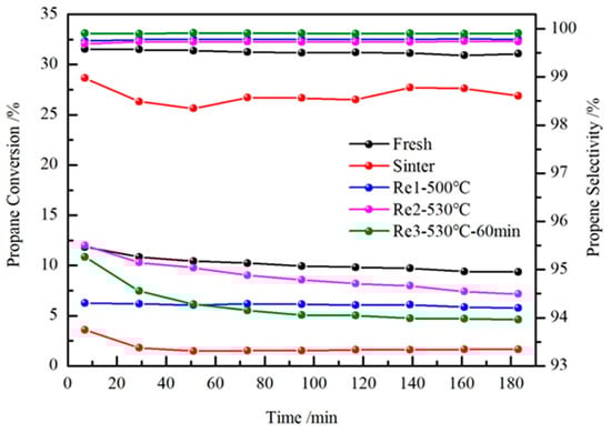 In the experiment, the regeneration temperature, oxygen concentration, chlorine concentration, and regeneration time were changed. The performance of these regenerated catalysts is shown in Figure 8. It was found that, compared with other factors, oxychlorination temperature had a major influence on the regeneration of Sinter-700 °C. The best initial propane conversion could reach 12.0% on the Re2-530 °C catalyst, which is close to the Fresh catalyst, when the regeneration temperature increased to 530 °C. But the activity of the Re2-530 °C catalyst decreased more rapidly than the Fresh catalyst during 3 h of reaction and far below those for Re-550 °C and Re-600 °C. Moreover, when the regeneration time is increased to 60 min, the initial propane conversion can only reach 10.8% and declines to only 5% after 3 h of reaction. These results indicated that the deactivation of the catalyst under 700 °C oxidation was not totally irreversible. By tailoring oxychlorination conditions to accelerate the redispersion rate, the catalyst structure could be partly restored after a certain time. This also indicated that the control of the oxidation temperature during the coke-burning process had a significant impact on the regeneration performance. When the catalyst was oxidized at different temperatures, the oxychlorination conditions should be tailored to favor its redispersion kinetics, as well as thermodynamic equilibrium state, for maximizing regeneration efficiency.