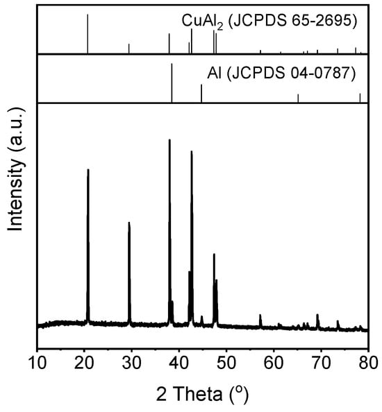 Firstly, the pristine RQ Cu–Al alloy is characterized by X-ray diffraction (XRD, Bruker D2 PHASER, Billerica, MA, USA). As presented in Figure 1, distinct peaks at 2θ of 20.7°, 29.4°, 37.9°, 42.6°, 47.4°, and 47.8° are indexable to the (110), (200), (211), (112), (310), and (202) reflections of the CuAl2 phase (JCPDS 65-2695). Additional peaks at 2θ of 38.5° and 44.7° are assignable to the (111) and (200) reflections of the α-Al phase (JCPDS 04-0787). The presence of the α-Al phase in addition to the CuAl2 phase is compatible with the bulk composition of the RQ Cu50Al50 alloy.