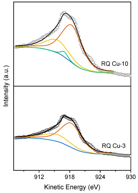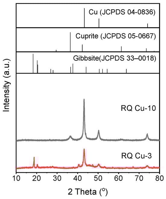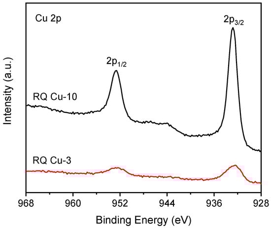 For heterogeneous catalysts, the surface composition and chemical state are closely related to the catalytic performance. Hence, X-ray photoelectron spectroscopy (XPS, Perkin-Elmer PHI 5000C, Waltham, MA, USA) is used to characterize the RQ Cu catalysts. Due to the relatively low content of Al and the overlapping of the Al 2p peak with the Cu 3p peak, the analysis of the Al 2p spectra is not performed. Figure 3 shows the Cu 2p spectra of RQ Cu-10 and RQ Cu-3. In the figure, the peaks with the binding energies (BEs) of 952.8 and 932.8 eV are ascribed to the Cu 2p3/2 and Cu 2p1/2 levels, respectively []. These peaks are much stronger for RQ Cu-10, which is in line with its higher bulk Cu content and larger SCu (Table 1). In addition, there is a broad feature at around 944 eV for RQ Cu-10, which is assigned to the shake-up peak of the Cu2+ species possibly due to the oxidation of a small fraction of metallic Cu to CuO during the washing and transfer of the sample.