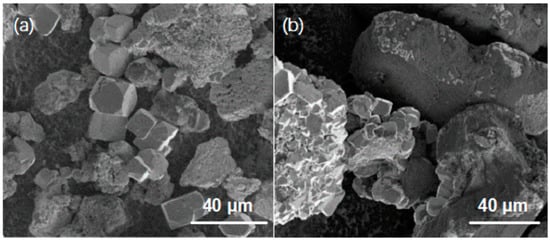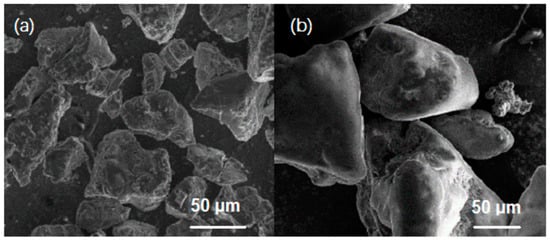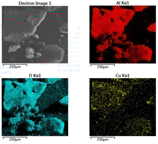 The morphologies of the RQ Cu catalysts are observed by scanning electron microscopy (SEM, FEI Nova NanoSem 450, Lausanne, Switzerland); the images are shown in Figure 5. After NaOH leaching, the particle sizes of the as-leached RQ Cu catalysts are somewhat smaller than that of the RQ Cu50Al50 alloy (100–200 meshes, i.e., 75–150 μm). As expected, the particle size of RQ Cu-10 with more Al being leached is smaller than that of RQ Cu-3. Moreover, RQ Cu-10 displays a rough and porous morphology as a result of the higher degree of Al leaching (Figure 5a), while the surface of RQ Cu-3 is relatively smooth (Figure 5b). The EDX mapping images of RQ Cu-3 as a representative shown in Figure 6 confirm the homogeneous distribution of the Cu, Al, and O elements on the surface.
