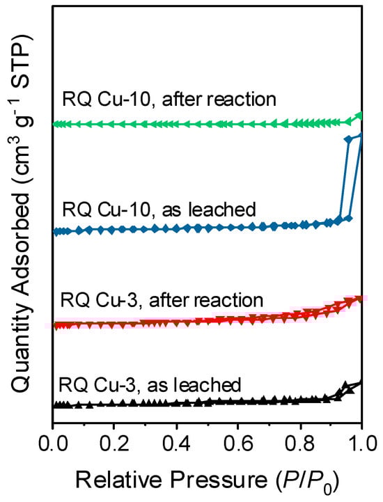 N2 physisorption isotherms at 77 K for the RQ Cu catalysts before and after reaction.