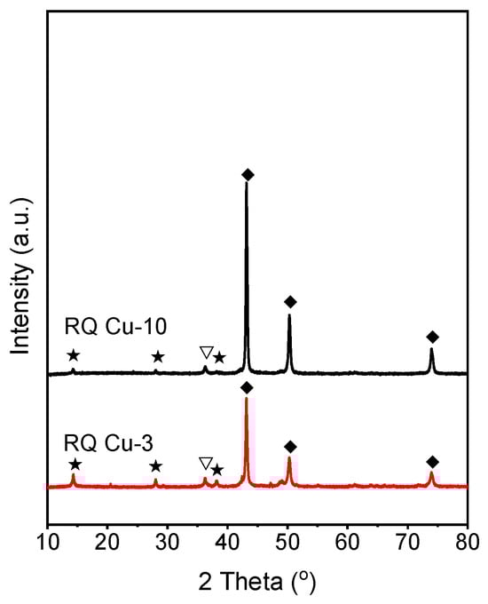 XRD patterns of the RQ Cu catalysts after reaction. ◆ Cu (JCPDS 04-0836), ▽ Cu2O (JCPDS 05-0667), and ★ Boehmite (JCPDS 21-1307).