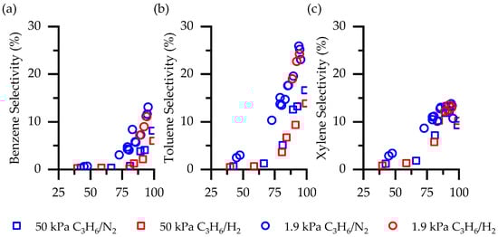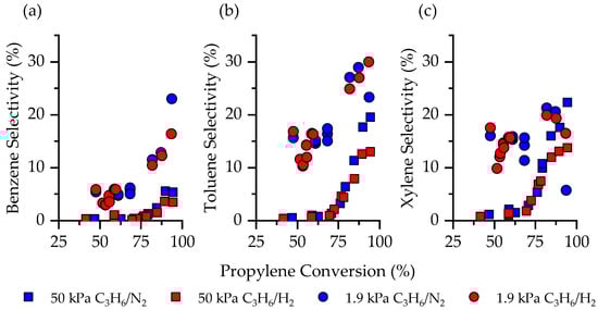 The conversion of propylene and other olefins to aromatics and hydrocarbons has been extensively studied. Here, we compare the products of propylene conversion with and without equimolar amounts of co-fed H2 at 723 K by comparing the product distribution of C3H6 aromatization at 50 kPa and 1.9 kPa partial pressure (balance N2). The space velocity was varied to give propylene conversions from about 30% to above 95%. The aromatic distribution (Figure 1) while feeding 50 kPa C3H6 is similar when co-feeding 50 kPa H2 or N2. All three aromatics (i.e., benzene, toluene, and xylene) have selectivities <2% up to conversions about 70% (Figure 1, squares). At propylene conversions above 70%, selectivity to benzene (Figure 1a), toluene (Figure 1b), and xylene (Figure 1c) increase substantially, ultimately reaching selectivities within error of 7%, 15%, and 9%, respectively.