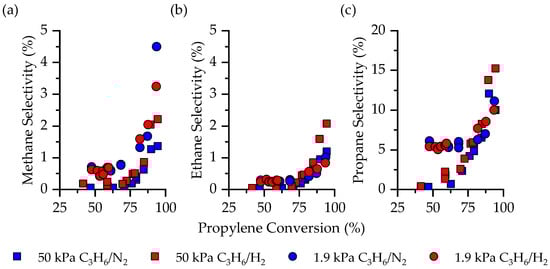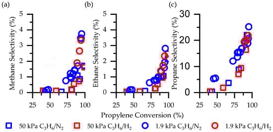 The selectivity to light alkanes (i.e., methane, ethane, and propane) have relatively constant (and low) selectivity until approximately 75% conversion and then begin to increase slightly. At 1.9 kPa C3H6 (blue circles), methane (Figure 6a), ethane (Figure 6b), and propane (Figure 6c) selectivity is constant at ≈ 0.7%, ≈ 0.3%, and 5%, respectively, until approximately 75% conversion, and then increase to 4%, 7%, and 11%, respectively. When co-feeding 1.9 kPa H2 (red circles), the trends are equivalent to that when co-feeding 1.9 kPa N2.