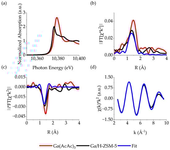 The XANES of Ga/H-ZSM-5 has an edge energy, defined as the inflection point in the initial rise in absorption, of 10,372.6 eV, and a white line energy (i.e., the energy at which the first maximum absorption occurs) of 10,376.2 eV (Figure 4a). Beyond the white line, there are shoulders near 10,381 eV, which has been previously reported to be characteristic of tetrahedral Ga3+ [39,40,41,42]. By comparison, the edge energy and white line energy for Ga(AcAc)3 are 10,376.5 and 10,379.0 eV, respectively.