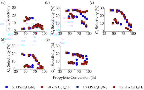 Ethylene selectivity (Figure 7a) at 1.9 kPa C3H6 (circles) is relatively constant (≈17%) until 70% conversion and then decreases to 6% at 94% conversion. C4 selectivity (Figure 7) when feeding 1.9 kPa C3H6 (circles) is relatively constant from 47–70% conversion and then decreases to 7% selectivity at 94% conversion. In 1.9 kPa, C3H6, C5, and C6 selectivity (Figure 7b and Figure 7c, respectively) have maximum selectivity at the lowest conversion measured and steadily decrease to <1% selectivity as conversion approaches 100%. Selectivity to C7+ species (Figure 7e) at 1.9 kPa (circles) is relatively constant at 8% across the conversion range tested. All the trends at 1.9 kPa are equivalent when co-feeding H2 and N2.