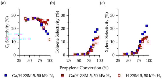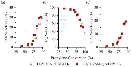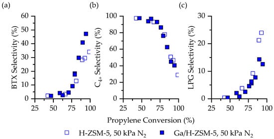 Comparison of (a) combined BTX, (b) hydrocarbons with at least four carbons, and (c) combined light gas (i.e., methane, ethane, and propane selectivity as a function of conversion on H-ZSM-5 (unfilled) and Ga/H-ZSM-5 (filled) for C3H6 aromatization). Reaction conditions: 50 kPa C3H6, 50 kPa N2, 723 K. Data reproduced from Figure 1, Figure 2, Figure 3, Figure 4, Figure 5, Figure 6 and Figure 7.