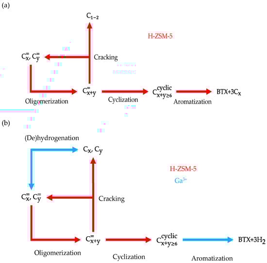 A simplified reaction mechanism for aromatization on (a) H-ZSM-5 and (b) Ga-modified H-ZSM-5. Red arrows represent reactions that predominantly occur on H-ZSM-5, and blue arrows represent reactions that predominately occur on Ga3+. and represent alkenes, where x and y are at least 2, and represent the respective alkanes and represents cyclic hydrocarbons with at least six carbons (i.e., the precursors to benzene, toluene, and xylene).
