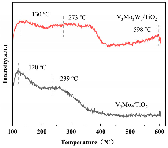 Figure 5 shows the NH3-TPD profiles of the V3Mo5/TiO2 and V3W3Mo3/TiO2 catalyst samples. The first NH3 desorption peaks of V3Mo5/TiO2 and V3W3Mo3/TiO2 catalysts occur at 120 °C and 130 °C, respectively, with similar NH3 desorption amounts. This suggests that the number of weak acidic sites on both catalysts is comparable. The desorption peaks observed in the low-temperature range are primarily influenced by VOx species, corresponding to the desorption of ammonium ions NH4+ adsorbed on weak Brønsted acidic sites generated by the addition of V2O5. The second NH3 desorption peak of the V3Mo5/TiO2 catalyst appears at 239 °C, while for the V3W3Mo3/TiO2 catalyst, the second NH3 desorption peak is observed at 273 °C, with a larger NH3 desorption amount. This indicates that the WO3-modified catalyst possesses a higher quantity of medium-strong acidic sites, mainly associated with WOx and MoOx species. These sites primarily consist of weakly stable Lewis acidic sites adsorbing ammonia NH3, with WOx species providing a greater number of acidic sites, resulting in a stronger surface acidity of the catalyst. The third NH3 desorption peak is observed at 598 °C for the V3W3Mo3/TiO2 catalyst, indicating that the addition of WO3 introduces new strong acidic sites to the catalyst, corresponding to the desorption of ammonia NH3 adsorbed on strong Lewis acidic sites.