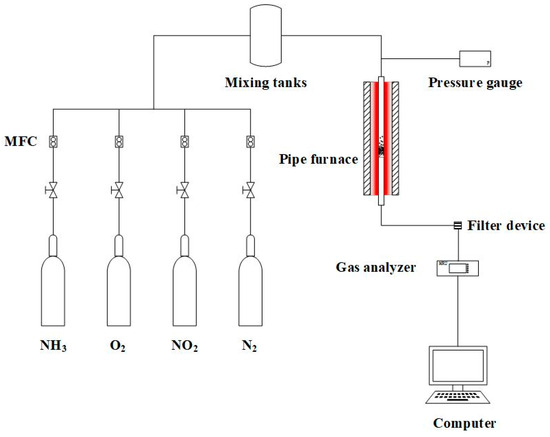 The catalyst activity testing equipment depicted in Figure 8 consists of a quartz tube. The inside diameter of the quartz tube reactor is 19 mm. The total gas flow rate entering the quartz tube is 120 mL/min. The catalyst quantity is 4 mL, with gas hourly space velocity of 1800 h−1. The inlet concentrations of the simulated flue gas components are [NO2] = [NH3] = 10,000 ppm and [O2] = 13%, with the remaining N2 serving as the balance gas. Initially, under a nitrogen atmosphere, the catalyst is preheated to 200 °C. Subsequently, the mixed gas is introduced for the SCR reaction. The exhaust gas is then connected to a flue gas analyzer. Data is recorded once the readings stabilize. The procedure is repeated at increments of 25 °C until reaching 400 °C. The catalytic efficiency of the catalyst can be calculated using the following formula: