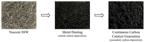 Two approaches are conceivable for combining metal- and carbon-catalyzed TCD. The first is where the metal dusting- and subsequent carbon-catalyzed TCD reactions are conducted at one common temperature. Higher temperatures accelerate the metal dusting and metal-catalyzed TCD, with the potential limitation of faster deactivation of the metal catalyst by coking, in part due to accelerated gas phase pyrolysis reactions forming deactivating PAHs. The second is a two-stage process wherein metal dusting and metal-catalyzed carbon formation are conducted at one temperature and, after sufficient carbon is formed, the temperature is increased to where the carbon itself then catalyzes TCD. It should be noted that in this approach, the second temperature stage is somewhat artificial, as metal dusting and catalyzed carbon will continue during the second stage at the higher temperature. A Rhoades American stainless steel wool grade #000 was used as the metal catalyst in the first-stage metal dusting reaction. This process is demonstrated in Figure 11 below.