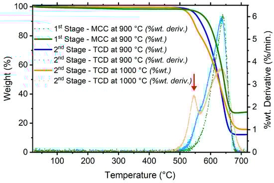 The deposition rate significantly increases in the second stage at 900 °C (1.97 × 10−3 mg/s·mg cat.) compared to the first stage (2.4 × 10−4 mg/s·mg cat.), largely reflecting the difference between MCC versus TCD between the two stages. However, when using 1000 °C in the second stage, the deposition rate (8.75 × 10−4 mg/s·mg cat.) is lower than in the second stage at 900 °C. Conducting the second stage at 900 °C results in the highest carbon yield change, as well as the highest deposition rate. This indicates that the conditions at 900 °C are particularly effective for the process, leading to substantial carbon deposition. The effectiveness at this temperature can be attributed to the optimal space velocity and catalyst mass used, which ensure that the carbon deposition is maximized.