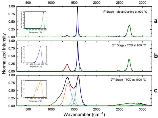Raman spectroscopy highlighting the different nanostructures of the TCD carbon (increasingly disordered—2nd stages (b,c)) and initial carbon deposit by metal dusting (ordered/graphitic—1st stage (a)) with inserts illustrating the different carbon phases through TGA weight loss derivatives.