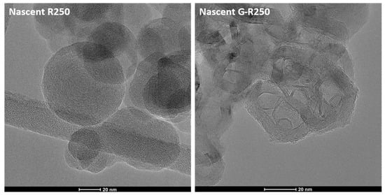 HRTEM images of nascent R250 and its graphitized analogue (G-R250) contrasting their different nanostructures.