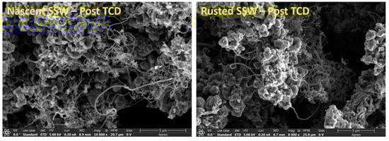 SEM images of nascent and rusted SSW post-TCD deposits using a mixture of 25% SNG with balance argon at 900 °C for 30 min.