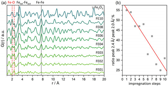 To track the crystalline nature of the iron oxide species, dPDF refinements were carried out using a maghemite phase (γ-Fe2O3) [56], which was shown to be beside α-Fe2O3, the main phase in powder X-ray diffraction (see Figure S3), in our earlier study on standard impregnation for 5–20 wt% Fe-loading (lower loadings of iron oxides on aluminum oxides are at present below the detection limit for dPDF) [51]. Again, in this multiple impregnation study, XAS analysis confirmed a high amount of Fetet, i.e., γ-Fe2O3-like species (vide infra). The lattice parameter a, the thermal displacement parameter Biso for Fe and O, as well as the correlated motion parameter δ2 were refined (for detailed information, see Table S1). Further, a spherical-shaped envelope accounting for the finite size effects of nanoparticles that subsequently lead to the dampening of the PDF was applied. The additional peak at 2.4 Å makes it especially hard to refine the PDF because this interatomic distance does not occur in the γ-Fe2O3 structure.
