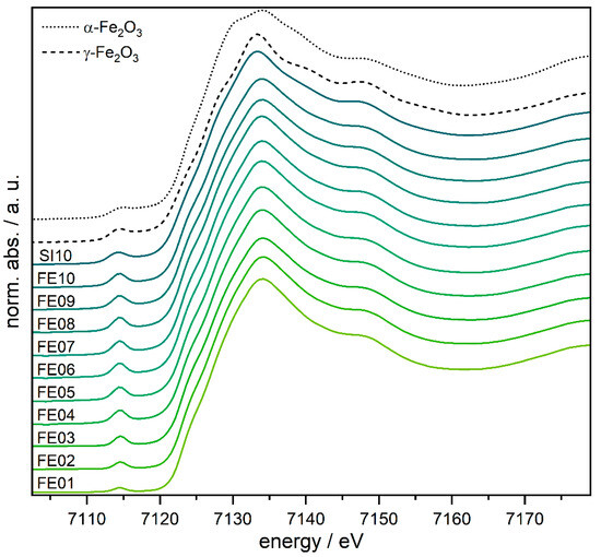XANES spectra of FE01–FE10, SI10, and the α- and γ-Fe2O3 references.