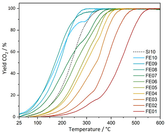 CO oxidation conversions of FE01–FE10 and SI10 under continuous heating with 2 °C/min up to 600 °C.