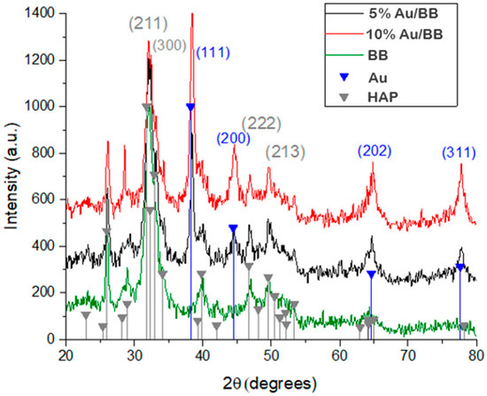 Figure 1 compares the patterns of BB (green), 5% Au/BB (black) and 10% Au/BB (red). In the case of bovine bone, the pattern showed signals at 2ϴ values of 22.88°, 25.89°, 29.17°, 32°, 33.19°, 40.14°, 46.99° and 49.66° that could be correlated with the following planes of hexagonal hydroxyapatite: (111), (002), (210), (211), (300), (130), (222) and (213), respectively (ICDD card: 00-086-0740). Likewise, the Au-NPs showed signals at 2ϴ value of 38.41°, 44.47°, 64.71° and 77.79° that could be correlated with the following planes of FCC Au: (111), (200), (202) and (311), respectively (ICDD card: 00-004-0783). The reflections associated with FCC Au in the BB sample were absent. However, for the 10% Au/BB sample, the reflections reached their maximum intensity, indicating a higher gold content in the sample.