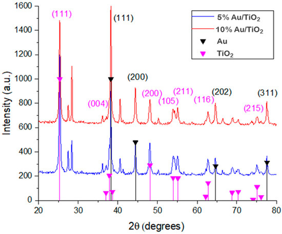 Figure 2 depicts the patterns of 5% Au/TiO2 (blue) and 10% Au/TiO2 (red). In the case of the support (TiO2), the pattern showed signals at 2ϴ values of 25.33°, 37.82°, 48.09°, 53.93°, 55.12°, 46.99°, 68.82° and 75.12° that could be correlated with the following planes of tetragonal TiO2 (anatase): (101), (004), (200), (105), (211), (116) and (215), respectively (ICDD card: 00-084-1286). Likewise, the Au-NPs showed signals at 2ϴ value of 38.41°, 44.47°, 64.71° and 77.79° that could be correlated with the following planes of FCC Au: (111), (200), (202) and (311), respectively (ICDD card: 00-004-0783). Signals of FCC Au could be observed in the 5% Au/BB sample and showed the highest peak for 10% Au/BB, showing a higher amount of gold in the sample.