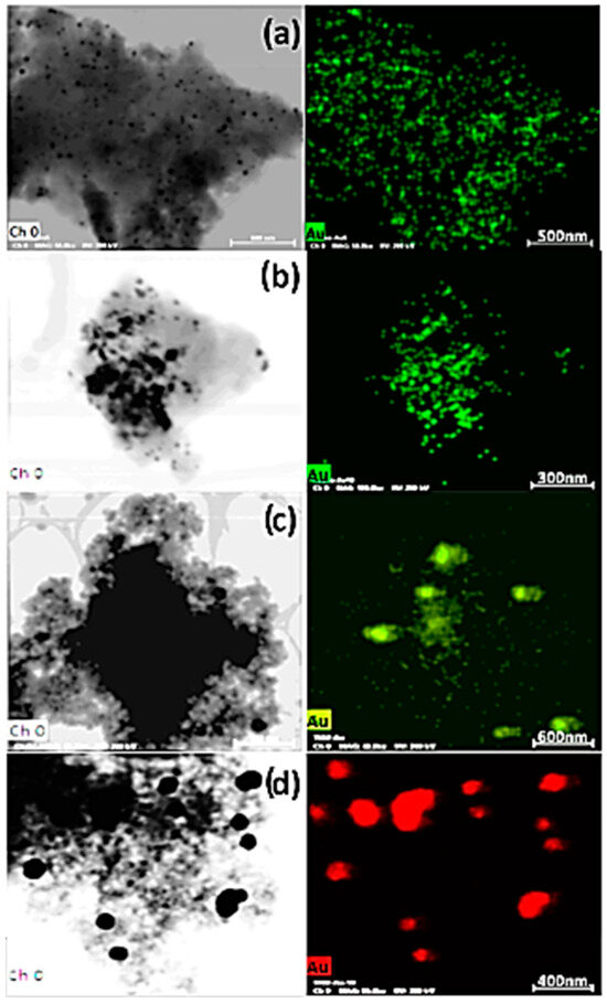 EDS elemental mapping of TEM of (a) 5% Au/BB, (b) 10% Au/BB, (c) 5% Au/TiO2 and (d) 10% Au/TiO2.