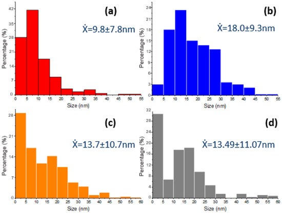 Size distribution histogram of Au nanoparticles for (a) 5% Au/BB, (b) 10% Au/BB, (c) 5% Au/TiO2 and (d) 10% Au/TiO2 from TEM observations.
