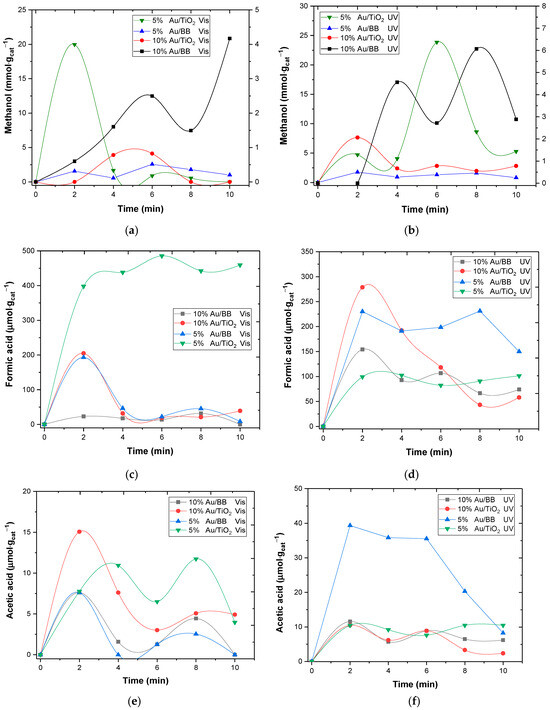 Figure 9a–f depicts the effect of the three assessed variables on the methanol, formic acid and acetic acid temporal concentration profiles. It is worth clarifying that in Figure 9a,b, the green line is the only one plotted with respect to the primary Y-axis, while the other ones were plotted with respect to the secondary Y-axis. This was because of the scale difference, i.e., the production with the 5% Au/TiO2 catalytic system was one order of magnitude higher than with the others. It can be observed that there was a maximum for all cases at relatively short reaction times (within the first 10 min of reaction). Regarding methanol, the highest concentration (24 mmol·) was found with the 5% Au/TiO2 and UV light system (Figure 9b). This value was followed by 20 mmol· obtained with the same catalytic system under visible light (Figure 9a), albeit with a shorter reaction time (2 min). The same catalytic system provided the highest concentration (~500 µmol·g−1) of formic acid, also under visible light (Figure 9c). By contrasting Figure 9e,f, it can be observed that when using UV light, the concentration of acetic acid was the highest (~40 µmol·g−1) when using the 5% Au/BB system.