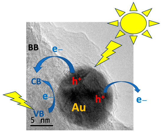 Figure 10 depicts the plausible electronic phenomena on the gold and BB surfaces when irradiated by visible light. According to Figure S1 (Supplementary Materials), the BB absorbs the energy of a wide wavelength range in the electromagnetic spectrum. This includes visible light. In the same Figure S1 (Supplementary Materials), for the gold-loaded BB, an absorption peak was observed between 538 and 550 nm. This peak was observed with 5% and 10% gold contents and could be ascribed to the surface plasmon resonance absorption inherent to gold nanoparticles [51]. This characteristic allowed us to presume that when the Au/BB materials were irradiated by visible light, this was energetic enough to generate electrons that were able to migrate to the support conduction band or to participate in the reactions depicted in Scheme 2. It is worth noticing that under visible light, the photo-generation of the hole–electron pair (h+–e−) is expected to also occur on the BB surface.
