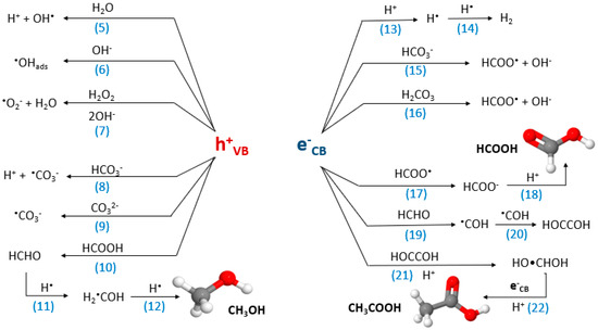 Reaction Scheme 2 depicts not only the plausible reactions to produce the oxidant and reductor species but also shows a proposed path to produce methanol, formic acid and acetic acid via reactions (11), (12), (15) and (17)–(22) on TiO2. This is expected [44] for TiO2; nevertheless, a similar path might be postulated for BB, albeit with some differences.