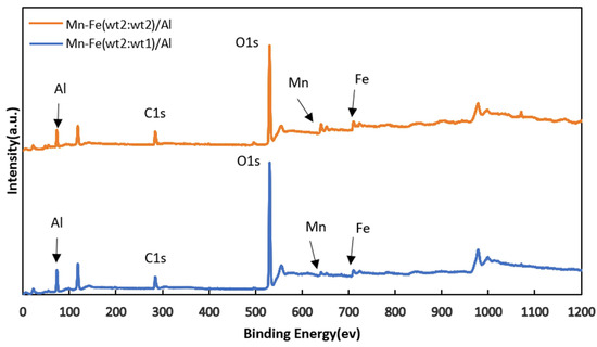 The XPS full spectra of the two catalysts, as depicted in Figure 2, displayed characteristic peaks corresponding to Al(2p) and O(1s) in γ-Al2O3 at 74.05 eV and 528.48 eV, respectively. The active components Fe(2p) and Mn(2p) exhibited characteristic peaks at 712.82 eV and 640.84 eV [24,25], respectively, while the characteristic peak of C(1s) was observed at 285.47 eV.
